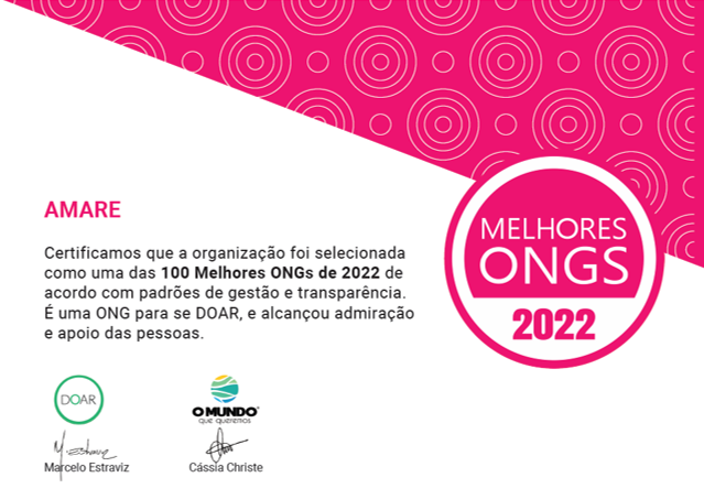 AMARE, hoje, ganha o reconhecimento como uma das 100 Melhores ONG’s do Brasil, graças à colaboração de todos os padrinhos, madrinhas, empresas amigas, funcionários e demais colaboradores.