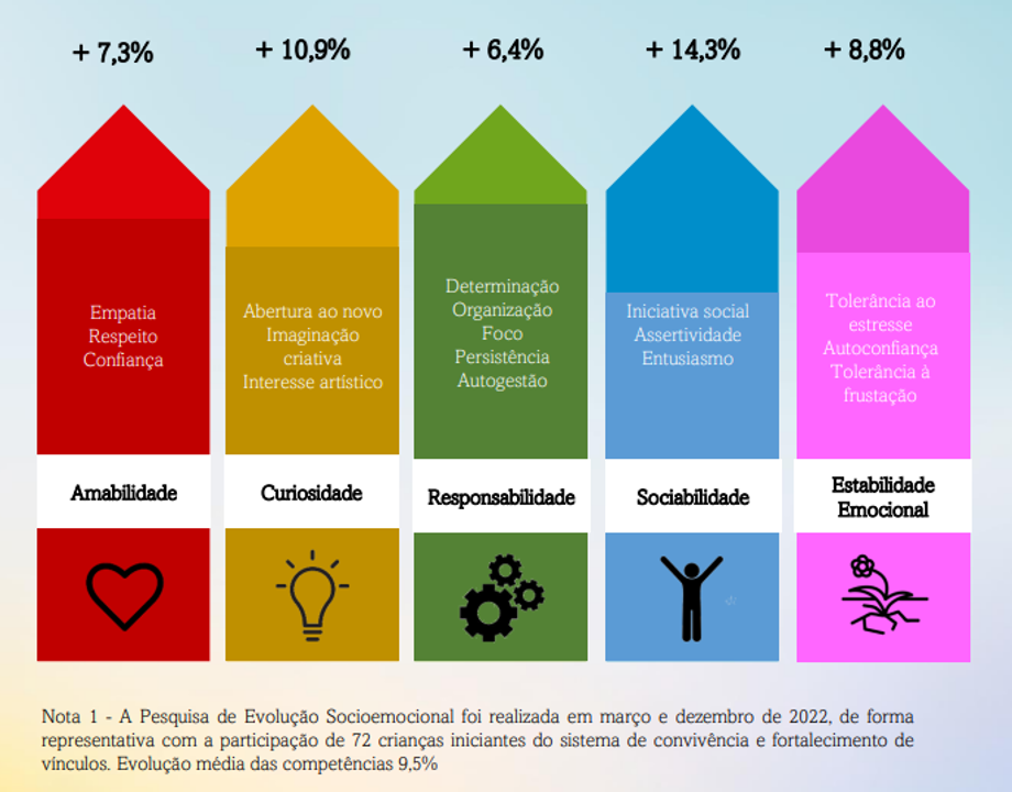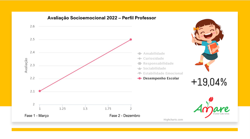 O departamento psicossocial da AMARE organizou a investigação da evolução das macrocompetências socioemocionais, conhecidas como “ Big Five”, e o desempenho escolar. A avaliação monitorou setenta e duas crianças, todos assistidos pela AMARE. Ela envolveu quatro olhares, – a perspectiva de pais ou responsáveis, a autoavaliação do próprio assistido, a percepção dos educadores sociais da instituição e dos professores da rede parceira de ensino. Por meio de um aplicativo próprio, desenvolvido pela equipe da organização, é visualizada a qualidade dos serviços de assistência prestados a família e a assistidos. Uma boa surpresa aconteceu no avanço expressivo do desempenho escolar dos assistidos, percebido na ordem de 19,04 por cento ao decorrer do ano letivo de 2022.