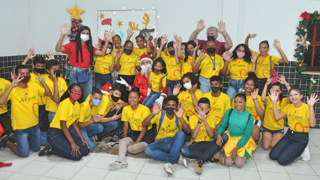 Em seguida, as educadoras acompanharam as crianças até a presença do Papai Noel que já estava sentado no seu trono no refeitório. Ele as presenteou com doces, bolos, uma caixa de chocolate e um kit higiênico a todos elas. Graças aos benfeitores da AMARE, nenhuma criança ficou sem seu presente de Natal.