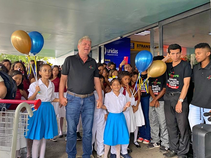 Enfim, quando a aeronave tão esperada pousou, as crianças já estavam preparadas para aquecer o coração de João Alemão. Ele não se conteve e em seus olhos surgiram lágrimas de gratidão. As pessoas, que ali passavam, se emocionavam ao ver que crianças vieram de tão longe para demonstrar o grande amor que floresce todos dos dias na AMARE. Em meio a lágrimas e sorrisos de gratidão, se comemorou esta data especial. Mas, as surpresas ainda não tinham chegado ao fim, pois ao entrar na cidade, o aniversariante foi contemplado com a visão de um outdoor em sua homenagem para agradecer pela sua importância na vida de crianças e adolescentes que tiveram a oportunidade de florescer.